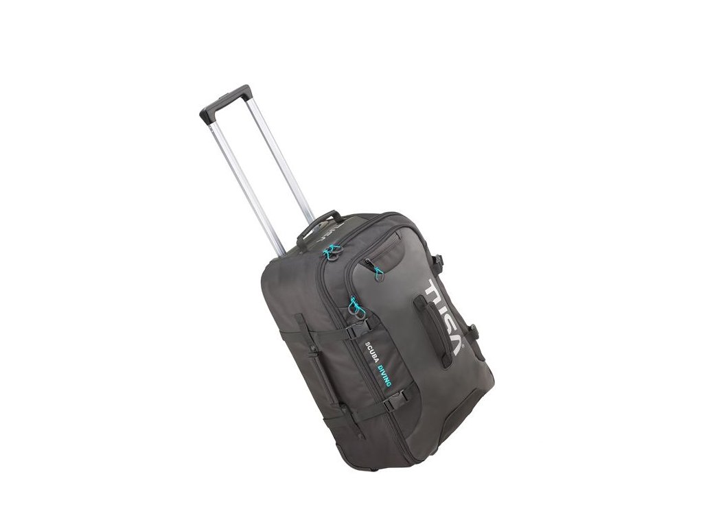 Špecializovaná transportná taška TUSA (edícia 2024) je navrhnutá pre náročnú logistiku potápačskej výstroje v sťažených podmienkach. Skelet tašky je konštruovaný z balistického nylonu 1680D s vysokou denierovou hodnotou, čo zaručuje extrémnu odolnosť voči abrázii a roztrhnutiu. Podvozkový systém využíva robustné, vymeniteľné kolieska s uzavretými ložiskami, ktoré sú odolné voči vniknutiu jemného piesku a soli. Vnútorná konfigurácia obsahuje fixačné popruhy pre stabilizáciu ťažkých komponentov (ako sú regulátory alebo backplate), zatiaľ čo externé kompresné popruhy minimalizujú objem pri čiastočnom naplnení. Dvojstupňová teleskopická rukoväť z eloxovaného hliníka zabezpečuje vysokú tuhosť pri manipulácii s plným zaťažením.