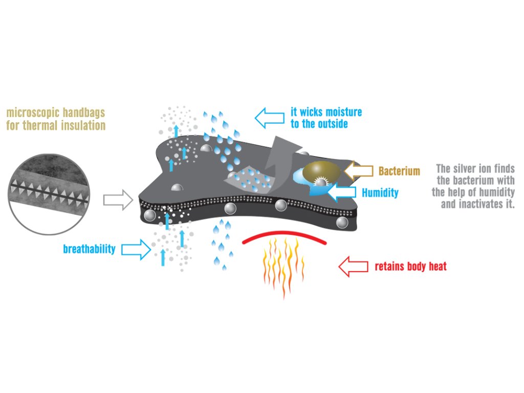 Strieborné ióny inaktivujú baktérie pri kontakte s vlhkosťou, čím udržiavajú tričko hygienické aj počas dlhých ponorov.
