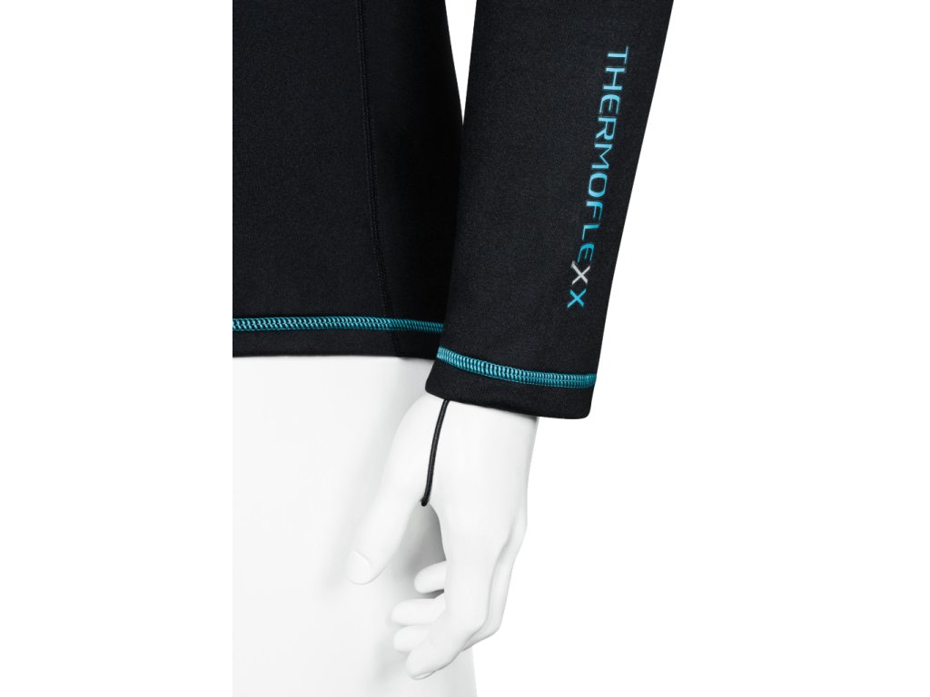 Dvojdielny podoblek Mola Mola ThermoFlexx je navrhnutý ako primárna tepelná ochrana pre potápačov používajúcich suché obleky v miernych až chladných vodách. Materiál ThermoFlexx využíva dvojvrstvovú konštrukciu, ktorá efektívne zachytáva izolačnú vrstvu vzduchu pri zachovaní minimálneho objemu a nízkeho vztlaku. Vďaka 4-smernej elasticite tkaniny poskytuje neobmedzený rozsah pohybu, čo je kritické pri technických úkonoch ako je 'valve drill'. Strih je optimalizovaný pre horizontálnu polohu (trim), pričom predĺžený top a vysoký pás nohavíc zabraňujú vzniku tepelných mostov v bedrovej oblasti. Systém aktívneho odvodu vlhkosti transportuje pot od pokožky do vonkajších štruktúr materiálu, čím udržuje potápača v suchu aj počas dekompresných zastávok.