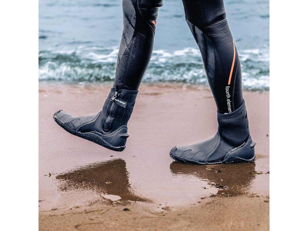 Fourth Element Pelagic sú vysokovýkonné potápačské topánky navrhnuté pre maximálnu tepelnú ochranu a stabilitu. Sú vyrobené z 6,5 mm neoprénu s vnútornou vrstvou z nylonu a polypropylénu, čo zabezpečuje vynikajúcu izoláciu v miernych až studených vodách. Unikátnym prvkom je integrovaná ergonomická stielka, ktorá poskytuje pevnú oporu klenby a päty (chassis), čím výrazne znižuje únavu chodidla pri dlhodobom plávaní proti prúdu alebo výstupe po rebríkoch. Topánka disponuje robustným YKK zipsom s poistkou (stopper), ktorá zabraňuje samovoľnému rozopnutiu počas ponoru. Oblasť nártu a päty je chránená dvojitou vrstvou vulkanizovanej gumy, ktorá zvyšuje odolnosť voči abrázii a mechanickému poškodeniu od remienkov plutiev.