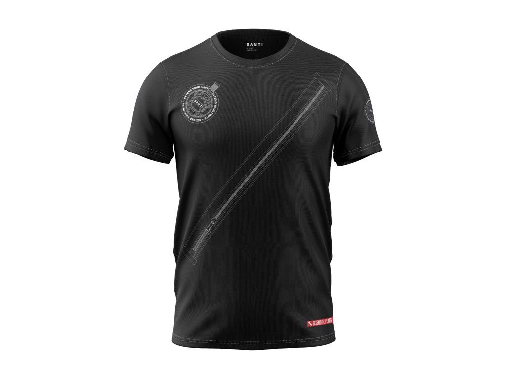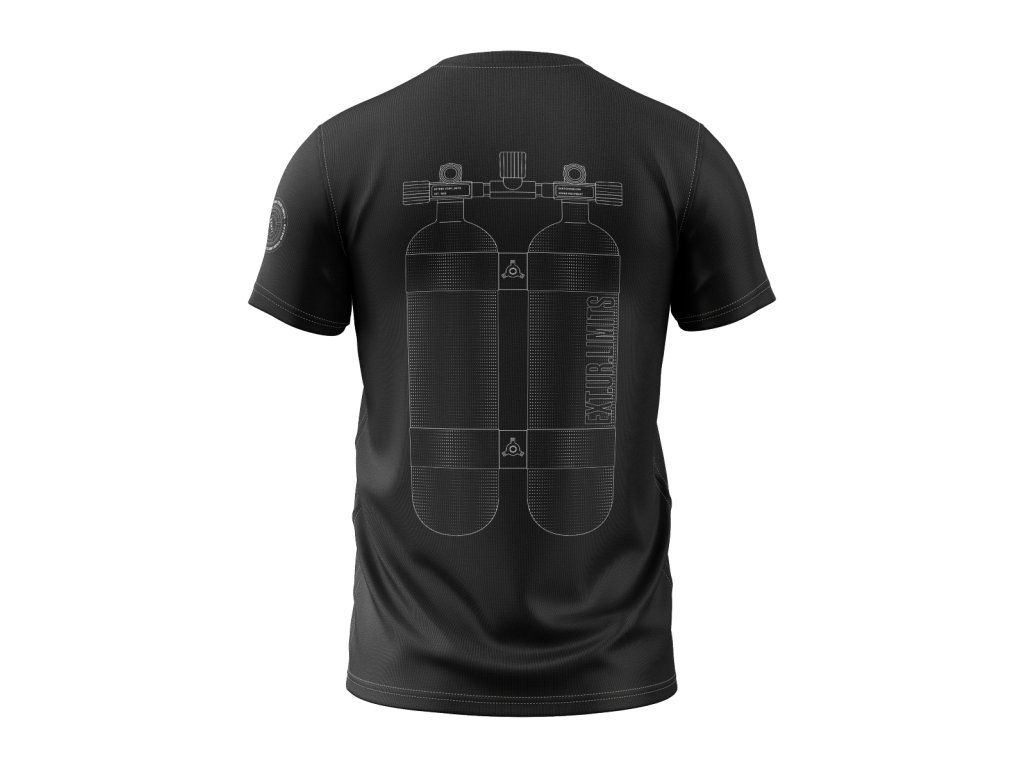 Čierne tričko s potlačou podobnou suchému obleku: suchý zips vpredu, ventily na hrudi a rukávoch a stupačky vzadu.